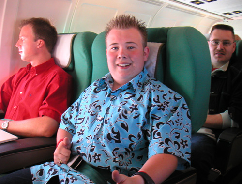 | Friday 12th April 2002. Flight AF4828, Paris to Rome Relaxing in Business Class: James Cadman and Phil Taverner (the single advantage of checking in very late!) 94Kb