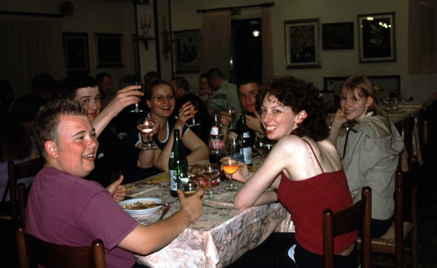 | Friday 12th April 2002. Evening Meal The Youngsters Table: James Cadman, Simon Hayward, Pascha Rees, Davey Watts, Jo Mellor, Jen Mellor 85Kb