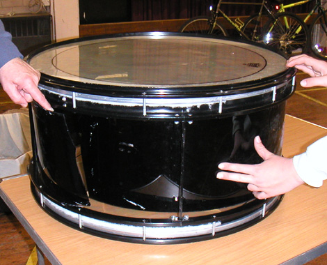 | Saturday 13th April 2002. Damage to the Bass Drum Souvenir of our flight from Birmingham The drum survived the weekend after application of gaffer tape and turning it upside down so that the damage wouldn't show 86Kb