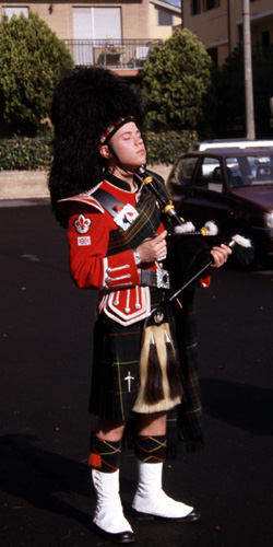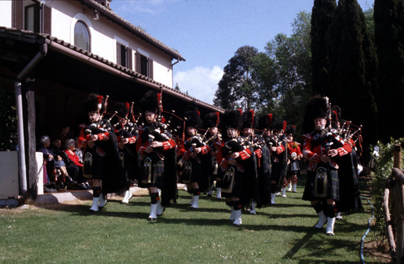 | Sunday 14th April 2002. Tuning Bagpipes (or Toning Bagpiper?) While most are tuning up, one is sunbathing!Davey Watts catching the morning sun