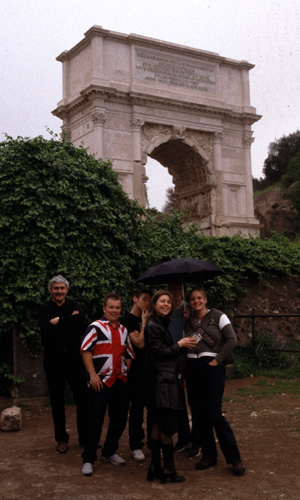 | Saturday 13th April 2002. Roman Forum Posed near arch: Andy King, James Cadman, Davey Watts, Lorena Pontecorvi, Jen Mellor, Pascha Rees 65Kb