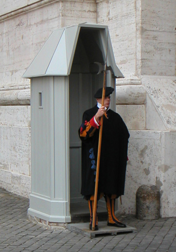| Saturday 13th April 2002. St. Peter's Square, Rome A Swiss Guard at the Vatican Gates Note that they wear their spats buttoned on the inside! 69Kb