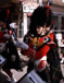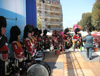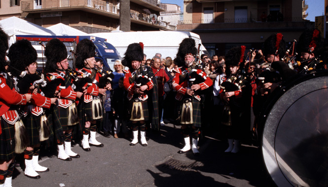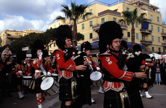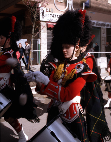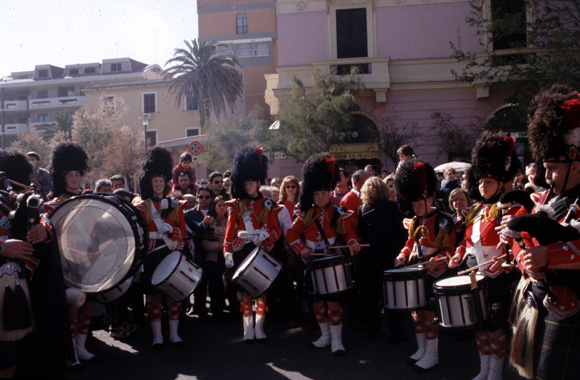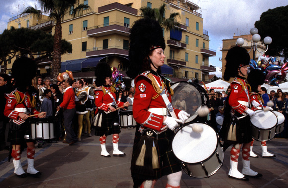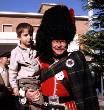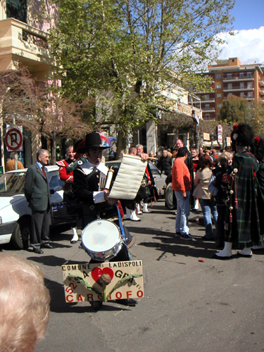 | Sunday 14th April 2002. Ladispoli Town Crier Equipped with (small) drum and microphone built into his hat, his job was to announce our presence (you would have thought they would notice anyway!)