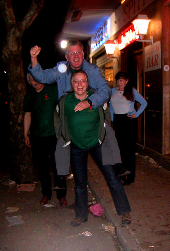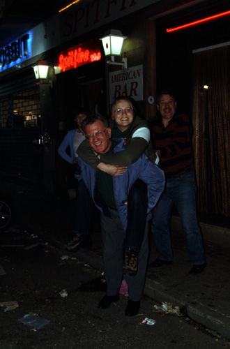 | Sunday 14th April 2002. Outside the Spitfire American Bar Piggyback Time: Andy King carries Marion Doyle