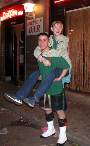 | Sunday 14th April 2002. Outside the Spitfire American Bar Piggyback Time: Davey Watts carries Jen Mellor