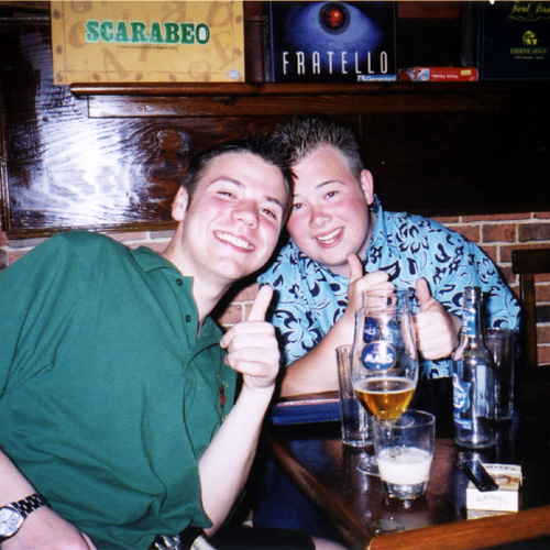 | Sunday 14th April 2002. Outside the Spitfire American Bar The night before the morning after: Davey Watts and James Cadman