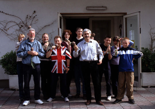 | Saturday 13th April 2002. Ladispoli Retirement Home Starting to march up the drive: Tom Taverner, Jo Mellor, Pascha Rees, Allan Baxter, Keith Murphy, Albert Hope, Phil Taverner, John Cadman, Carl Gray, Denis Carter, Marion Doyle, Davey Watts, Dave Mellor, Andy King