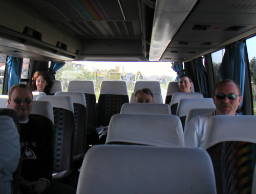 | Monday 15th April 2002. Coach to the Airport Have Jo and Simon fallen out? Carl Gray, Jo Mellor, Keith Murphy, Simon Hayward, John McGee 59Kb