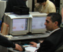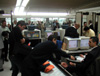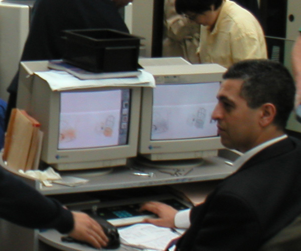 | Monday 15th April 2002. Security Scan at Paris Notice skeleton of feather bonnet on screens to the right? See next image for close-up 72Kb