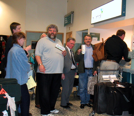 | Friday 12th April 2002. Birmingham Airport Relaxing before the flight: Phil Taverner, Carl Gray, Andy King, John McGee, Allan Baxter, Keith Murphy