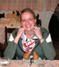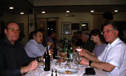 | Friday 12th April 2002. Evening Meal Whatever Allan has in his mouth, it is taking some swallowing! Allan Baxter, Keith Murphy, Chris Hughes, John McGee, John Cadman On right: Phil Taverner, Carl Grey, Andy King, Denis Carter, Marion Doyle, Albert Hope 88Kb